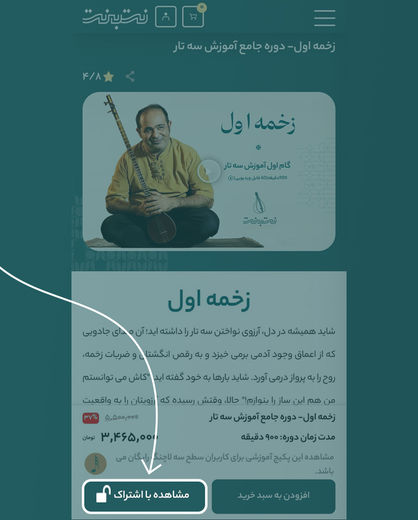 ب- کمی صفحه را به بالا اسکرول کنید تا لیست دوره های آموزشی سه تار را ببینید. فرض بر این است که می خواهید پکیج زخمه اول را تهیه کنید. پس آن را لمس کنید.