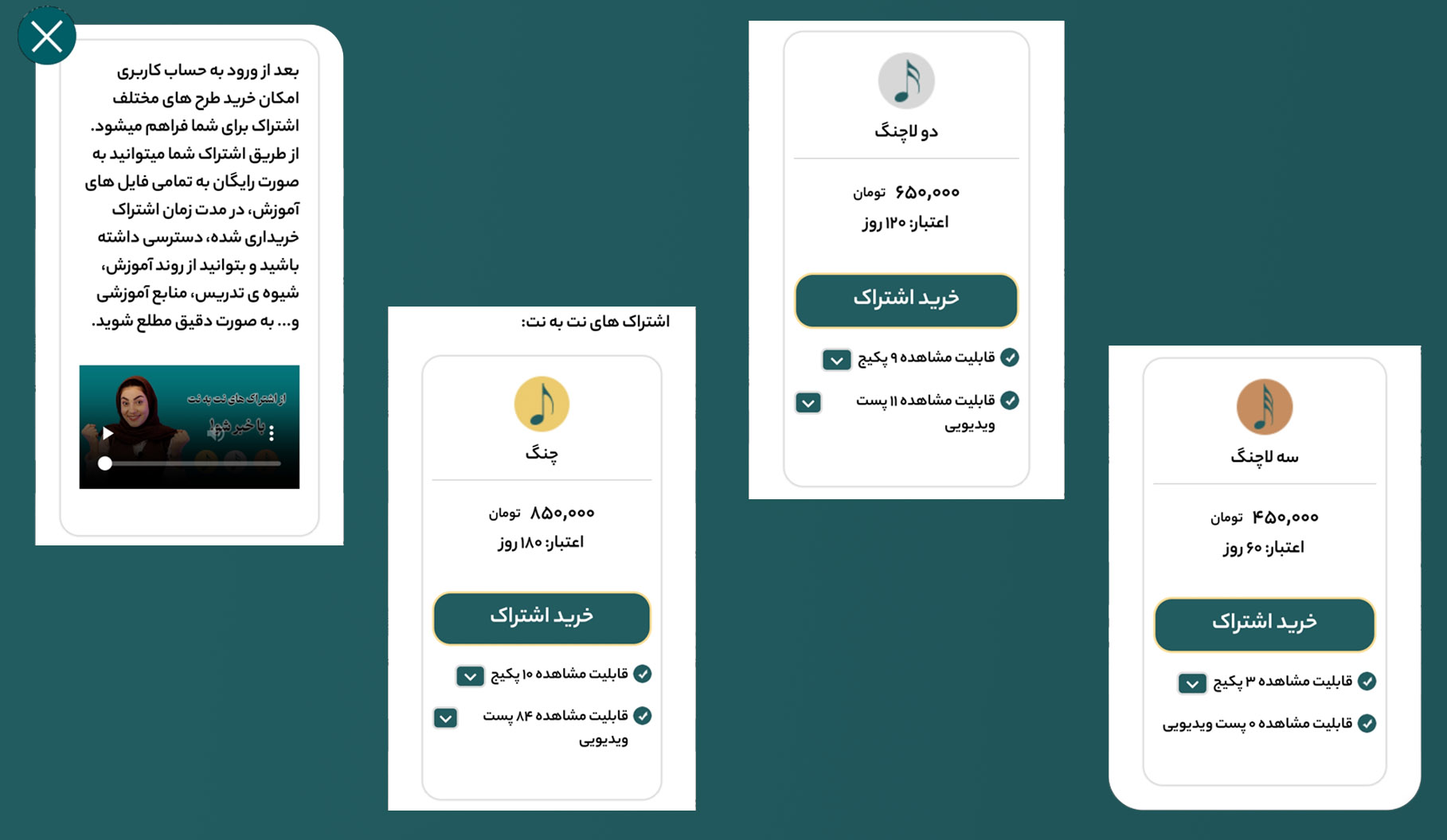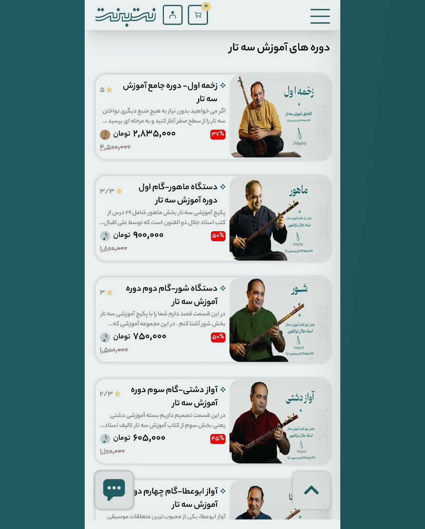 ب- کمی صفحه را به بالا اسکرول کنید تا لیست دوره های آموزشی سه تار را ببینید. فرض بر این است که می خواهید پکیج زخمه اول را تهیه کنید. پس آن را لمس کنید.