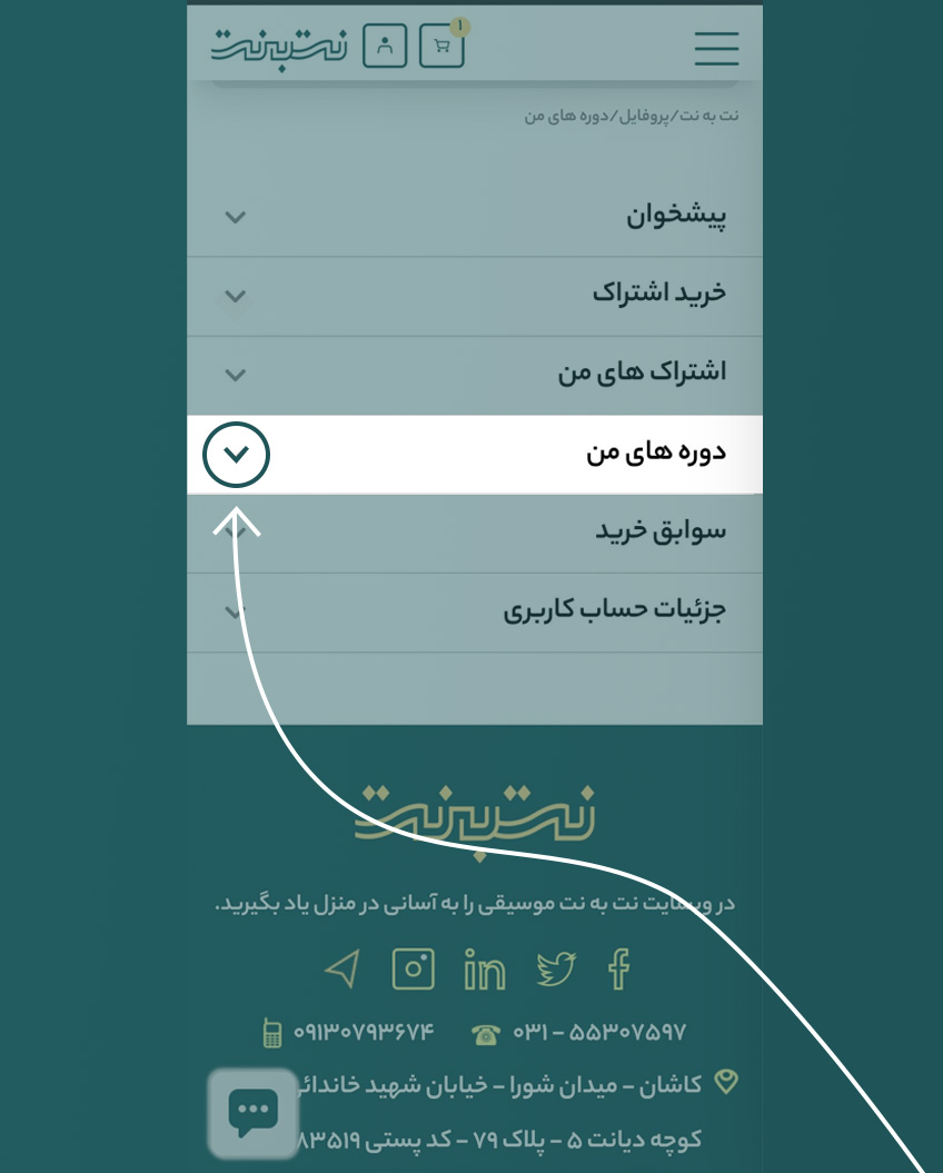 به تصویر زیر نگاه کنید، در سمت راست بالای پروفایل، آیکن سه خطی را مشاهده میکنید. آن را لمس کنید تا منو باز شود. با باز شدن منو، دوره های آموزش شاخه مورد نظر خود را لمس کنید. مثلا فرض کنید می خواهید یکی از پکیج های سه تار را بخرید.